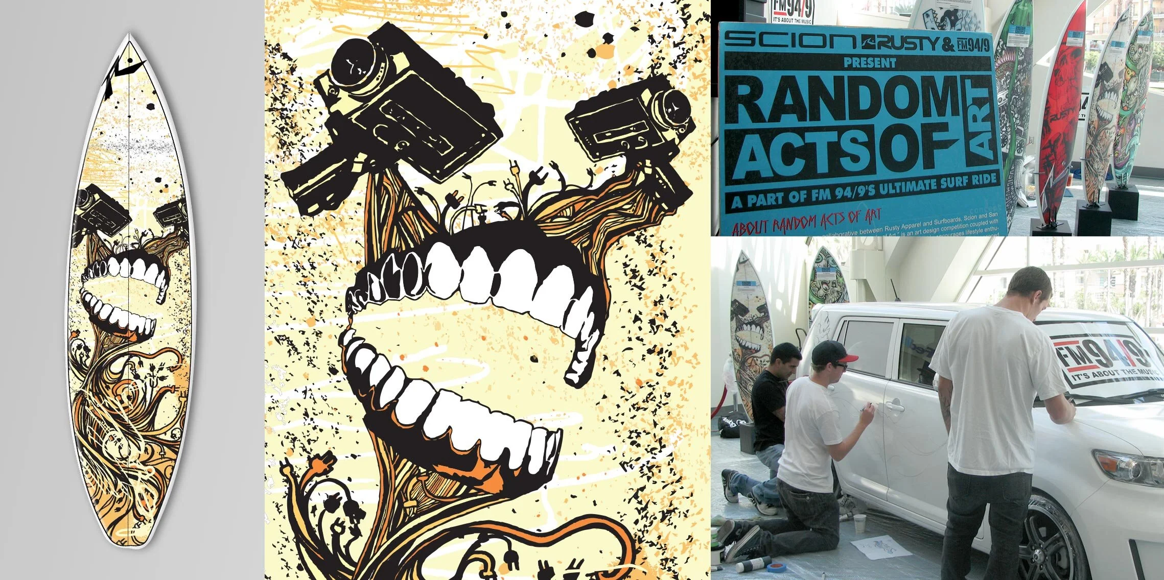 Towards the end of the summer of 2008 my artwork as well as art from nine other artists works were selected by a panel of judges and printed on surfboards for Rusty Surfboards, Scion, and FM949’s Random Acts of Art. The boards were on display at the ASR show, which was one of the largest action sports retail conventions at that time, before being auctioned at Scion dealerships for charity.